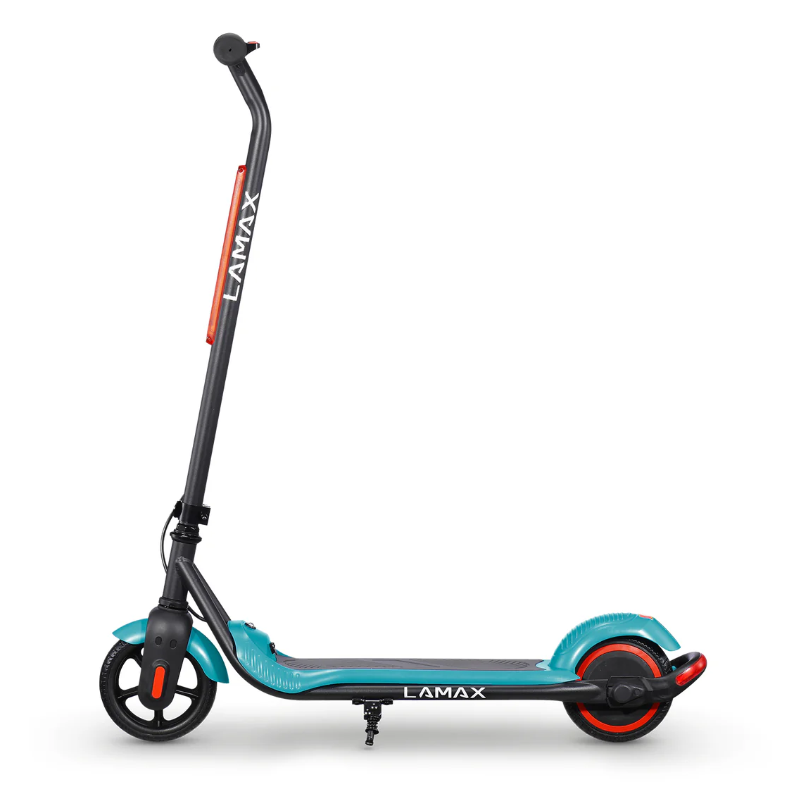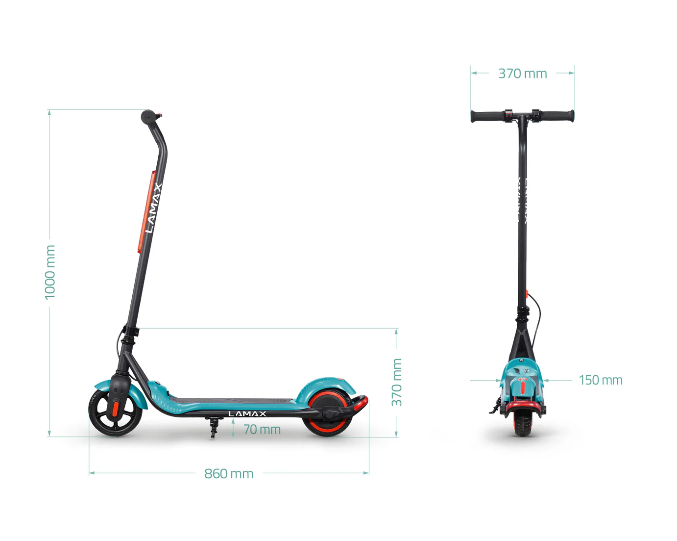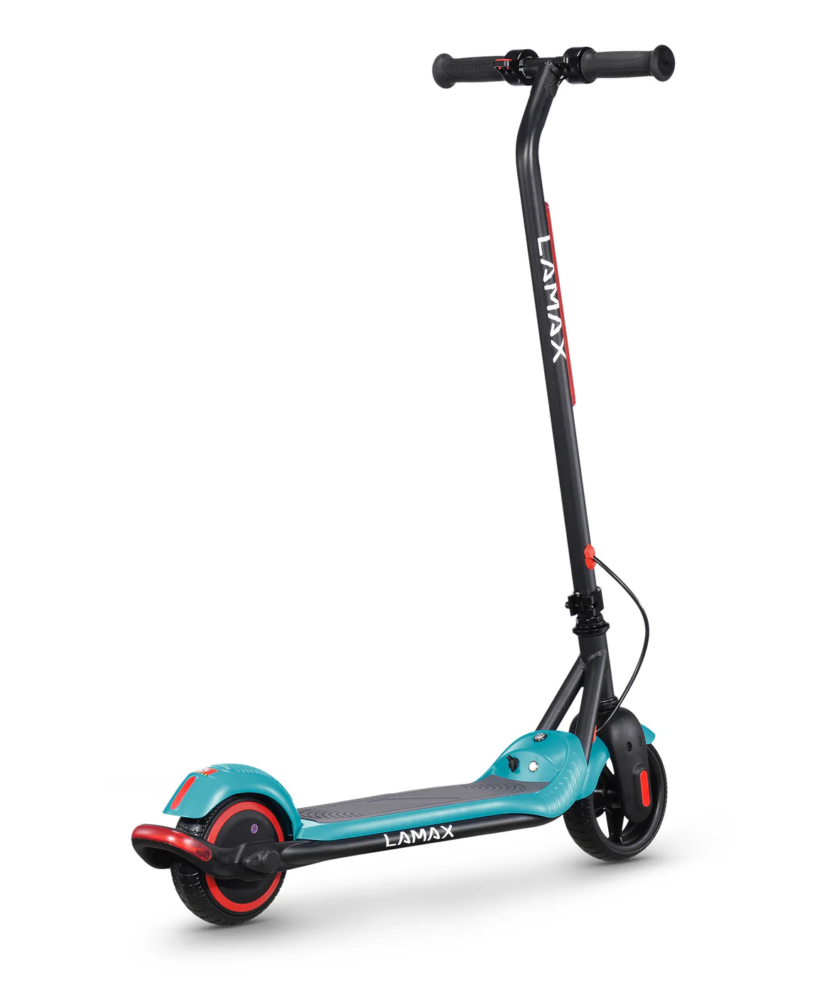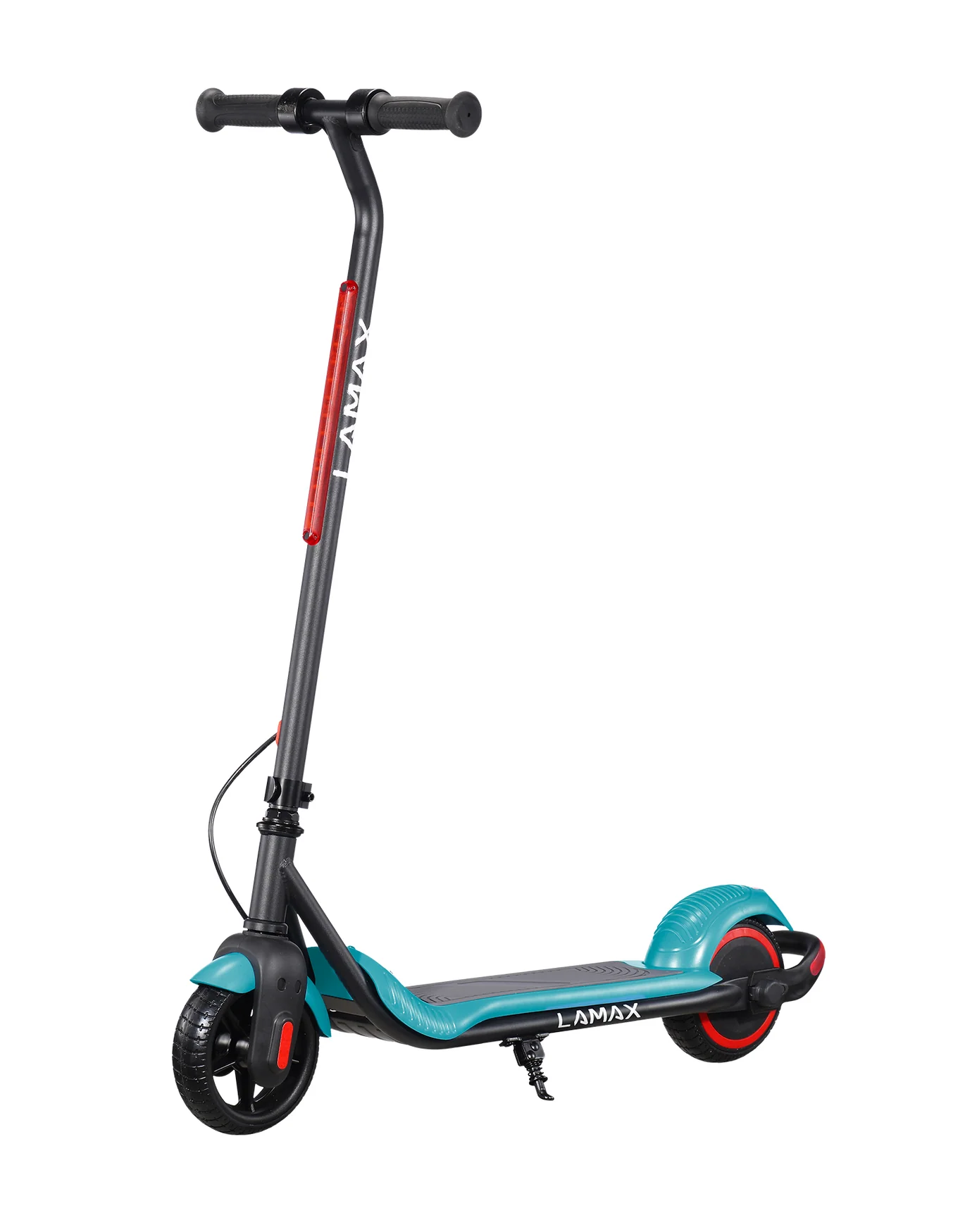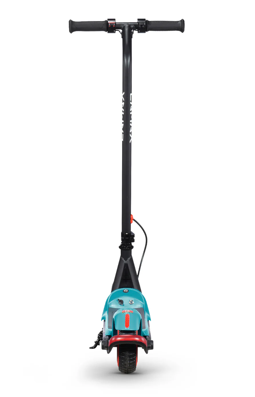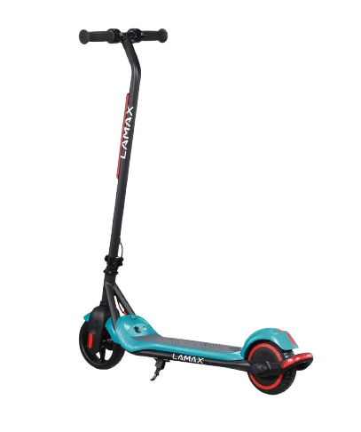 LAMAX eFlash SC20 si získava pozornosť už na prvý pohľad vďaka atraktívnemu dizajnu v kombinácii čiernej a tyrkysovej farby, ktorá pôsobí sviežo a športovo. Kolobežka má kompaktné rozmery 88 × 100 × 37 cm v rozloženom stave, čo ju robí vhodnou pre deti a zároveň praktickou pre prenášanie či skladovanie. Oceľová konštrukcia je pevná a odolná, ale zároveň ľahká, takže aj dieťa zvládne kolobežku zdvihnúť alebo presunúť. Kolesá s priemerom 6,5 palca sú vyrobené z pevného perforovaného materiálu, ktorý eliminuje riziko defektu a nevyžaduje údržbu ako nafukovacie pneumatiky. Kolobežka ponúka LED osvetlenie vpredu, ktoré zvyšuje viditeľnosť v podmienkach so zníženou viditeľnosťou, a zadné brzdové svetlo, ktoré upozorňuje ostatných účastníkov cesty, keď dieťa spomalí. Praktickou funkciou je aj skladací mechanizmus riadidiel, ktorý umožňuje rýchle zloženie a jednoduché uskladnenie. Bezpečnostná poistka “zero-start” zaisťuje, že sa kolobežka nerozbehne sama od seba – motor sa aktivuje až po odraze nohou, čo je pre deti bezpečnejšie. Na palubnej doske sa nachádza LED indikátor batérie, ktorý jasne ukazuje, kedy je potrebné kolobežku nabiť. Obsah balenia pritom zahŕňa všetko potrebné: samotnú kolobežku, nabíjačku, sadu skrutiek, náradie a návod. Vďaka tejto kompletnej výbave môžu deti začať jazdiť okamžite a rodičia majú istotu, že im nič nechýba.