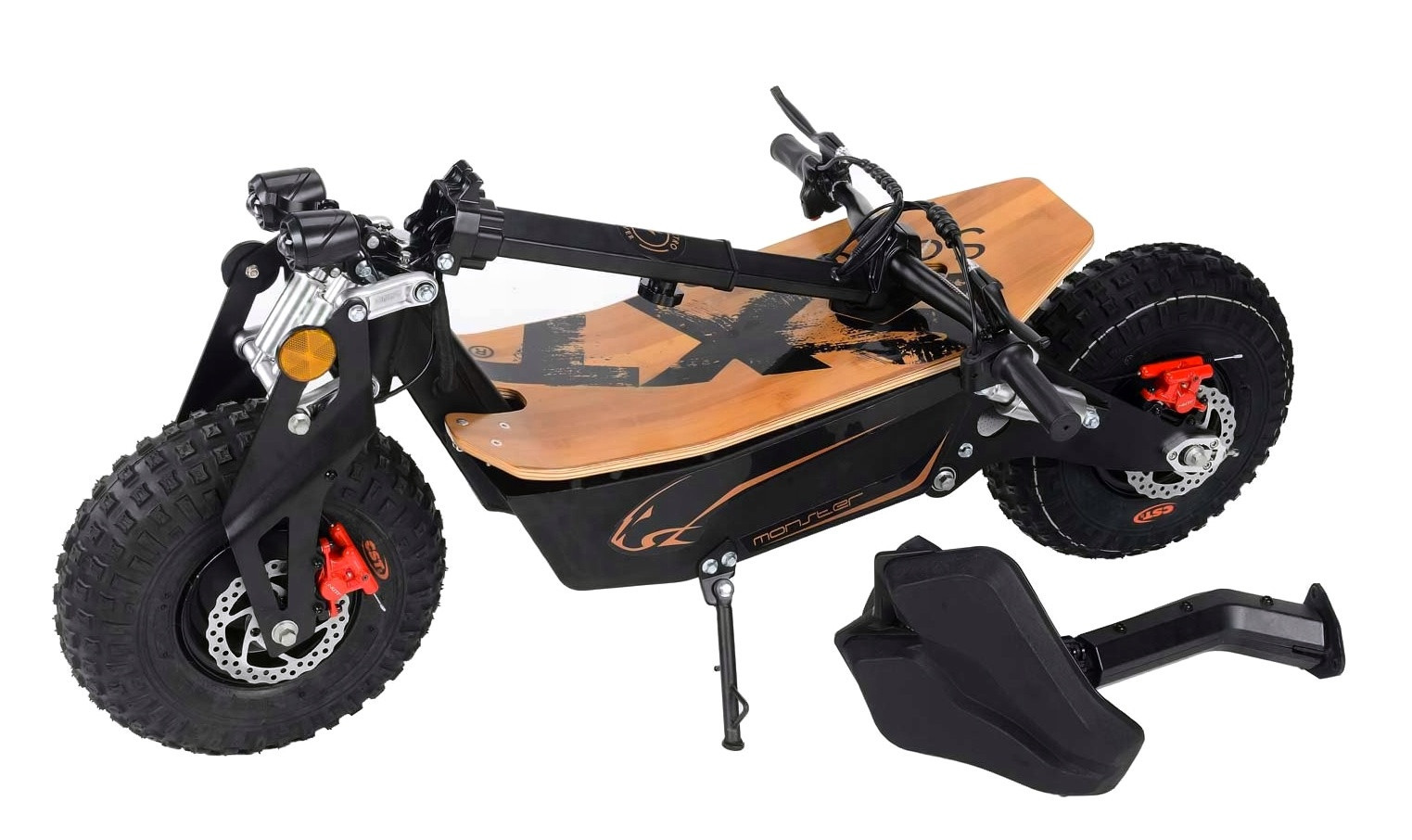 Táto kolobežka umožňuje pohodlnú jazdu v teréne, pričom ako jedna z mála je vybavená sedadlom. Monster má obrovské vzduchom plnené kolesá, aké poznáte skôr zo štvorkoliek, než z kolobežiek, vďaka čomu je skutočne pohodlná a zvládne aj ťažší terén. Poháňané je zadné koleso, pričom o prenos výkonu sa stará reťaz. Pohodlie zabezpečuje podvozok, ktorý má aj vpredu aj vzadu zdvojené tlmiče.