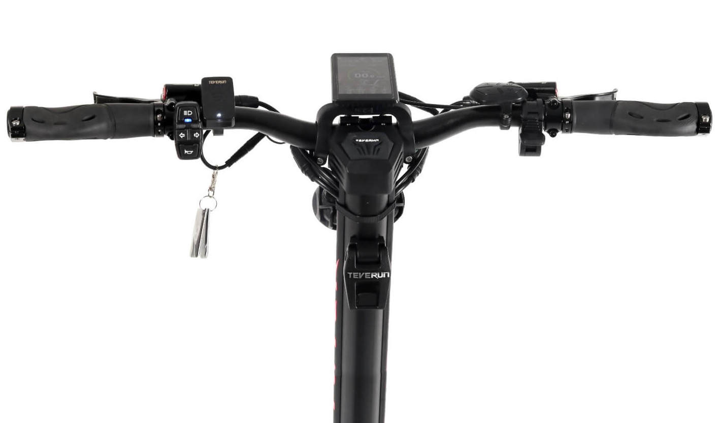 Vrcholu tyče riadenia dominujú 64,5 cm široké a sklápacie riadidlá s ergonomickými gripmi pre prvotriedne pohodlie na dlhých výjazdoch. Medzi nimi presne v strede dominuje pýcha značky Teverun, a to 3,5-palcový TFT displej. Na trhu nenájdete displej s pokročilejšími funkciami a prehľadnejšou grafikou, ktorá vám poskytne všetky údaje o jazde a možnosti nastavenia. Navyše ponúka prepojenie cez Bluetooth a vzdialené ovládanie cez aplikáciu. Inovácie pokračujú aj keď budete chcieť kolobežku odblokovať. Stačí jednoducho priložiť NFC čip k čítačke. Kým čip opäť nepriložíte, kolobežka zostane odblokovaná. Pri ľavej ruke máte okrem čítačky pod kontrolou ovládače svetiel, smeroviek a klaksón. Pravou rukou zase ovládate displej a jazdné módy. Samozrejmosťou je ikonický čierny design s RGB podsvietenými detailami po celom tele.