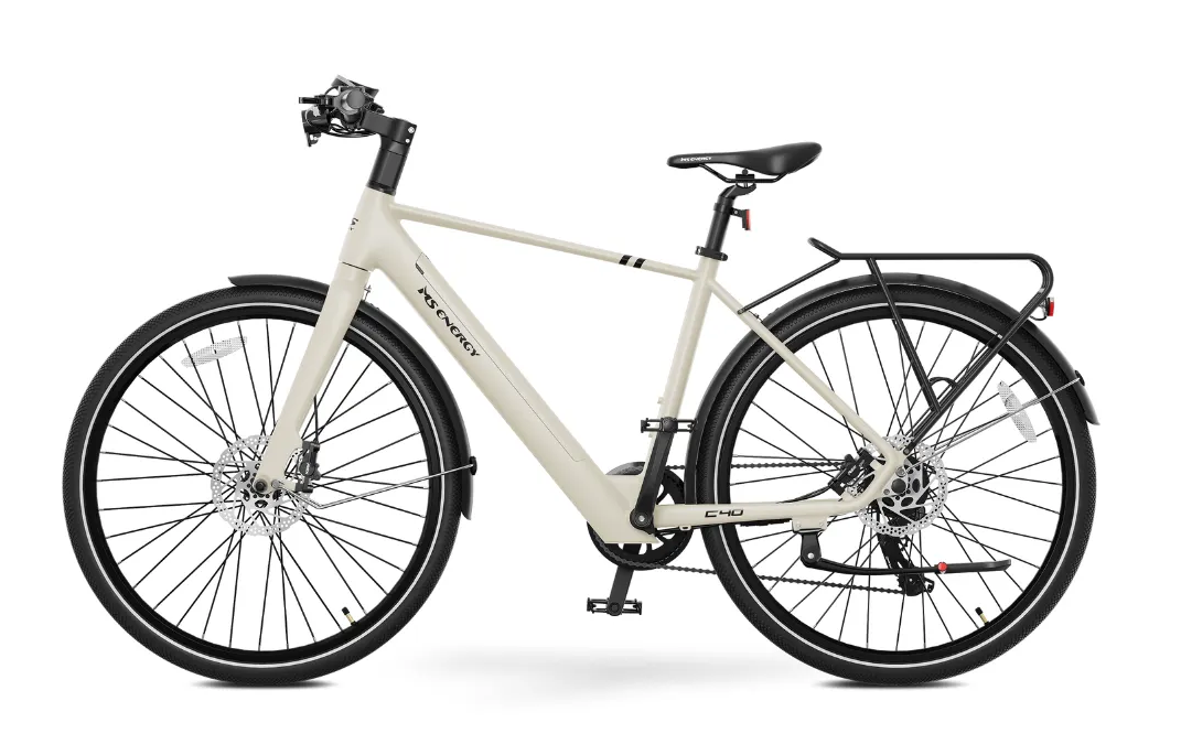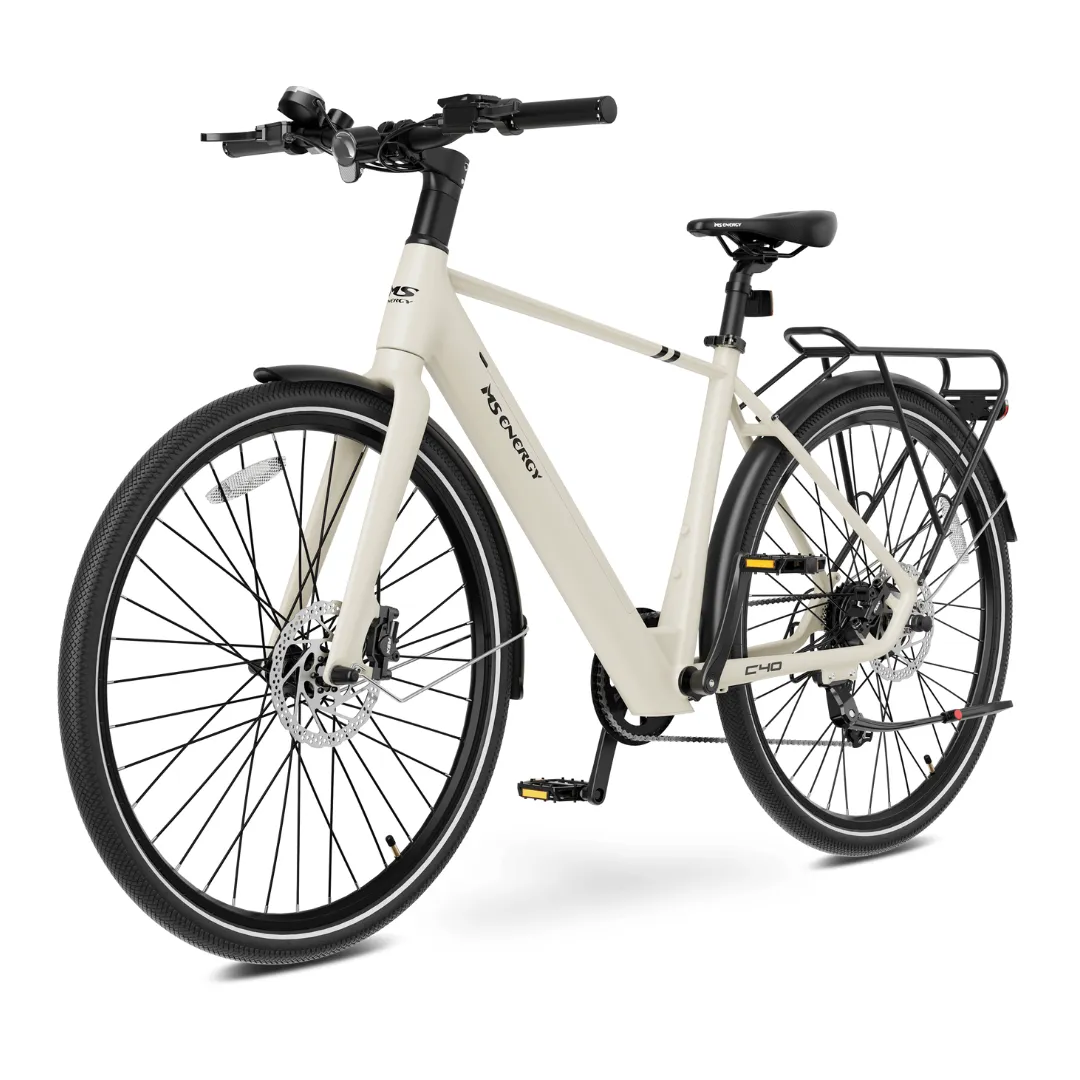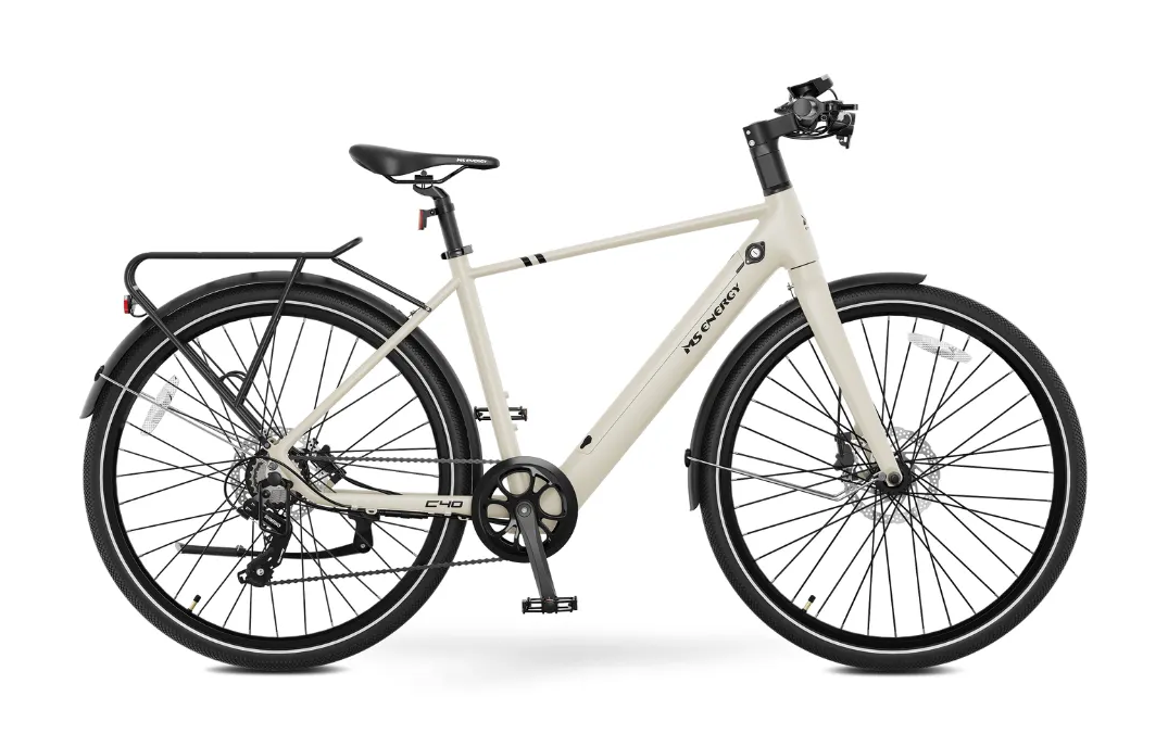 Moderný mestský elektrický bicykel MS ENERGY C40 (2025) s 250 W motorom, dojazdom až 60 km, hydraulickými brzdami, ľahkým 21 kg hliníkovým rámom a integrovanou 36 V/10 Ah batériou pre pohodlnú a bezpečnú jazdu.