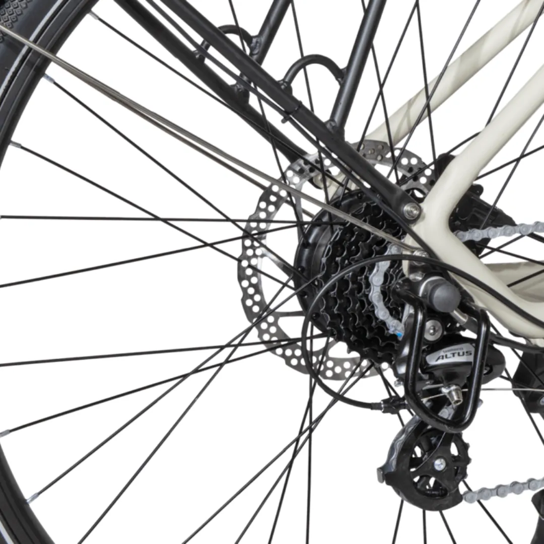 Dizajn MS ENERGY C40 je kombináciou minimalistickej estetiky a praktických detailov, ktoré zvyšujú pohodlie a životnosť bicykla. Rám je vyrobený z hliníkovej zliatiny 6061, opracovanej technológiou SMT pre hladké spoje bez viditeľných zvarov. Vnútorné vedenie káblov nielen zlepšuje vzhľad, ale chráni elektrické komponenty pred poškodením. 28-palcové kolesá s odolnými plášťami 700 × 45 C sú navrhnuté pre mestské povrchy a poskytujú dobrú stabilitu aj pri vyšších rýchlostiach. Radenie je zabezpečené spoľahlivým systémom Shimano ALTUS RD-M310-L s 8 prevodmi ovládanými páčkou Shimano SL-M315-8R, čo umožňuje plynulú zmenu rýchlosti podľa terénu a situácie v premávke. Na bezpečné brzdenie slúžia hydraulické kotúčové brzdy vpredu aj vzadu, ktoré poskytujú konzistentný brzdný výkon za každého počasia. Moderný LCD displej zobrazuje rýchlosť, stav batérie, prejdenú vzdialenosť a aktuálny režim asistencie. Osvetlenie tvorí predné LED svetlo a integrované zadné svetlo, vďaka čomu je jazda bezpečná aj v zhoršených svetelných podmienkach.